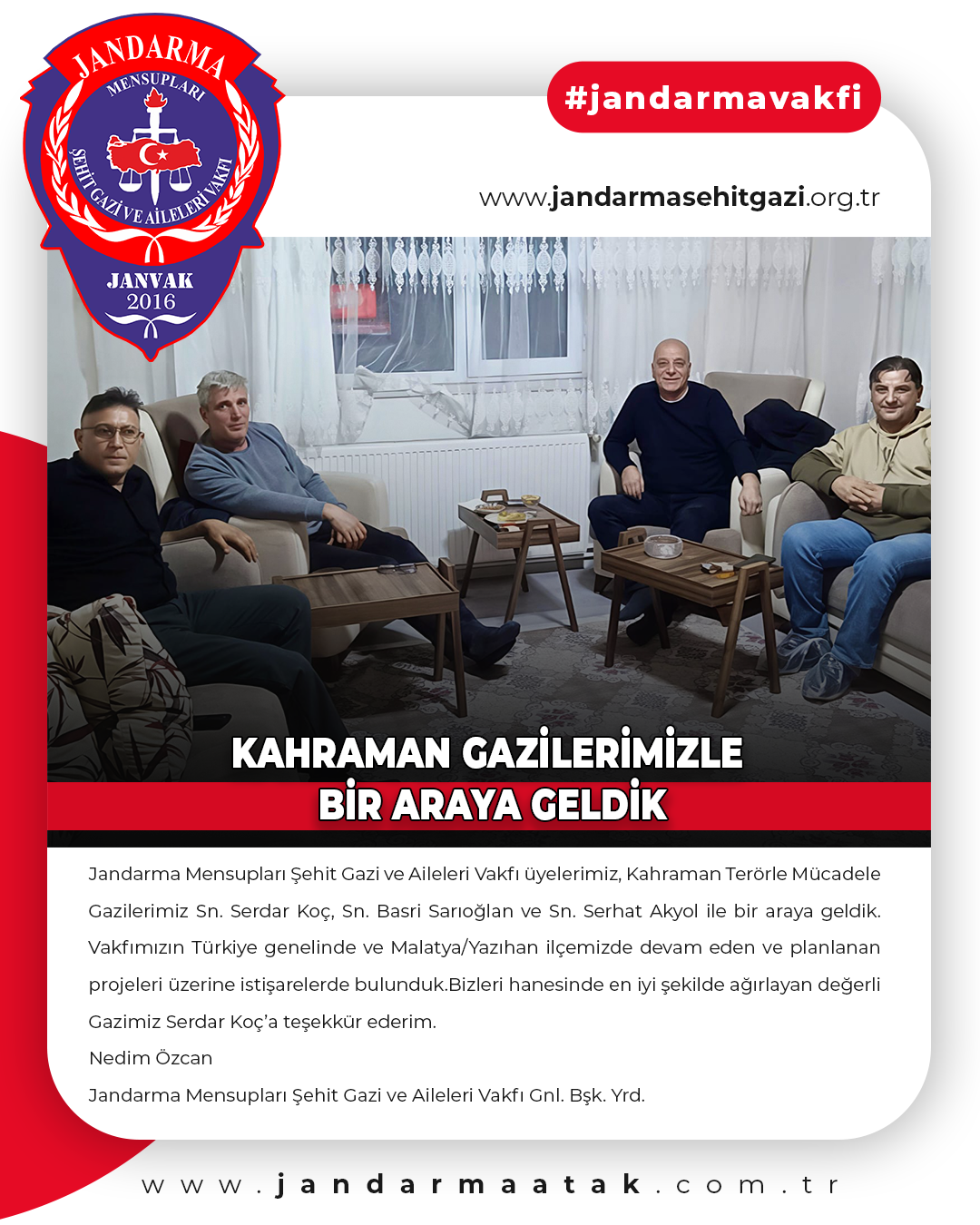 Jandarma Mensupları Şehit Gazi ve Aileleri Vakfı üyelerimiz, Kahraman Terörle Mücadele Gazilerimiz Sn. Serdar Koç, Sn. Basri Sarıoğlan ve Sn. Serhat Akyol ile bir araya geldik. Vakfımızın Türkiye genelinde ve Malatya/Yazıhan ilçemizde devam eden ve planlanan projeleri üzerine istişarelerde bulunduk.