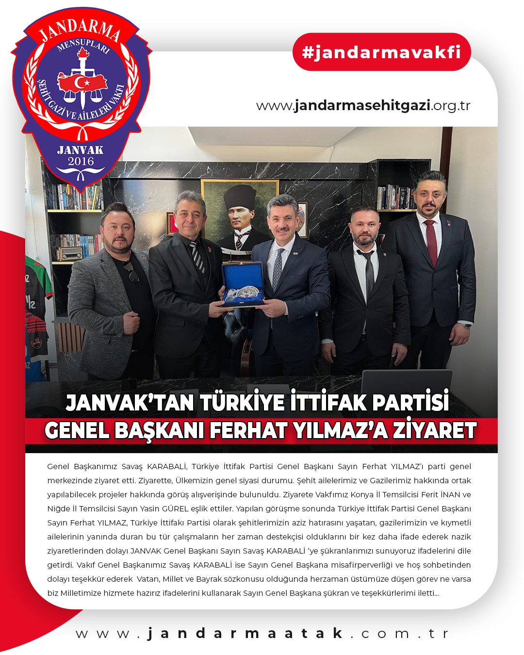 Yapılan görüşme sonunda Türkiye İttifak Partisi Genel Başkanı Sayın Ferhat YILMAZ, Türkiye İttifakı Partisi olarak şehitlerimizin aziz hatırasını yaşatan, gazilerimizin ve kıymetli ailelerinin yanında duran bu tür çalışmaların her zaman destekçisi olduklarını bir kez daha ifade ederek nazik ziyaretlerinden dolayı JANVAK Genel Başkanı Sayın Savaş KARABALİ ‘ye şükranlarımızı sunuyoruz ifadelerini dile getirdi.