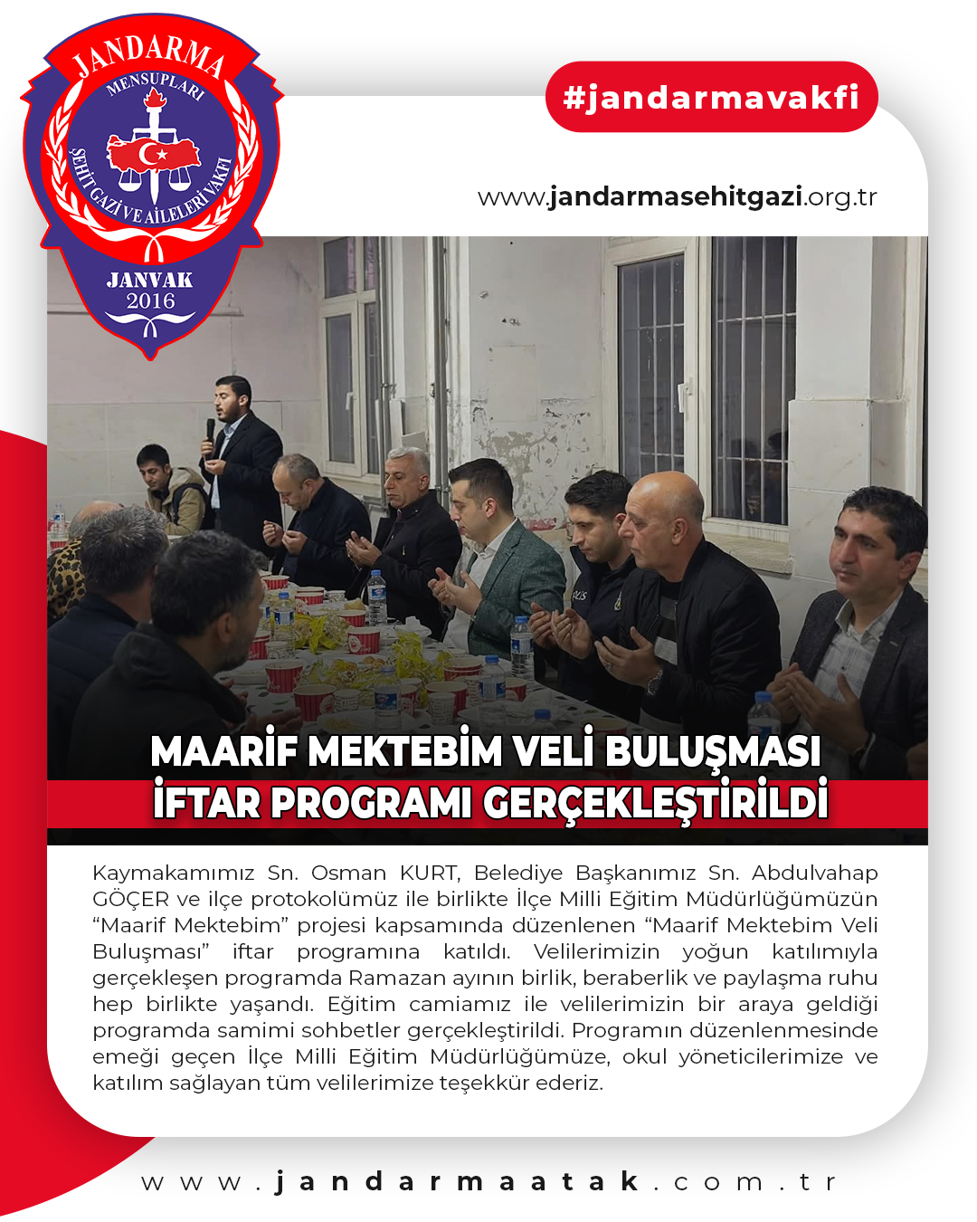 Kaymakamımız Sn. Osman KURT, Belediye Başkanımız Sn. Abdulvahap GÖÇER ve ilçe protokolümüz ile birlikte İlçe Milli Eğitim Müdürlüğümüzün “Maarif Mektebim” projesi kapsamında düzenlenen “Maarif Mektebim Veli Buluşması” iftar programına katıldı.