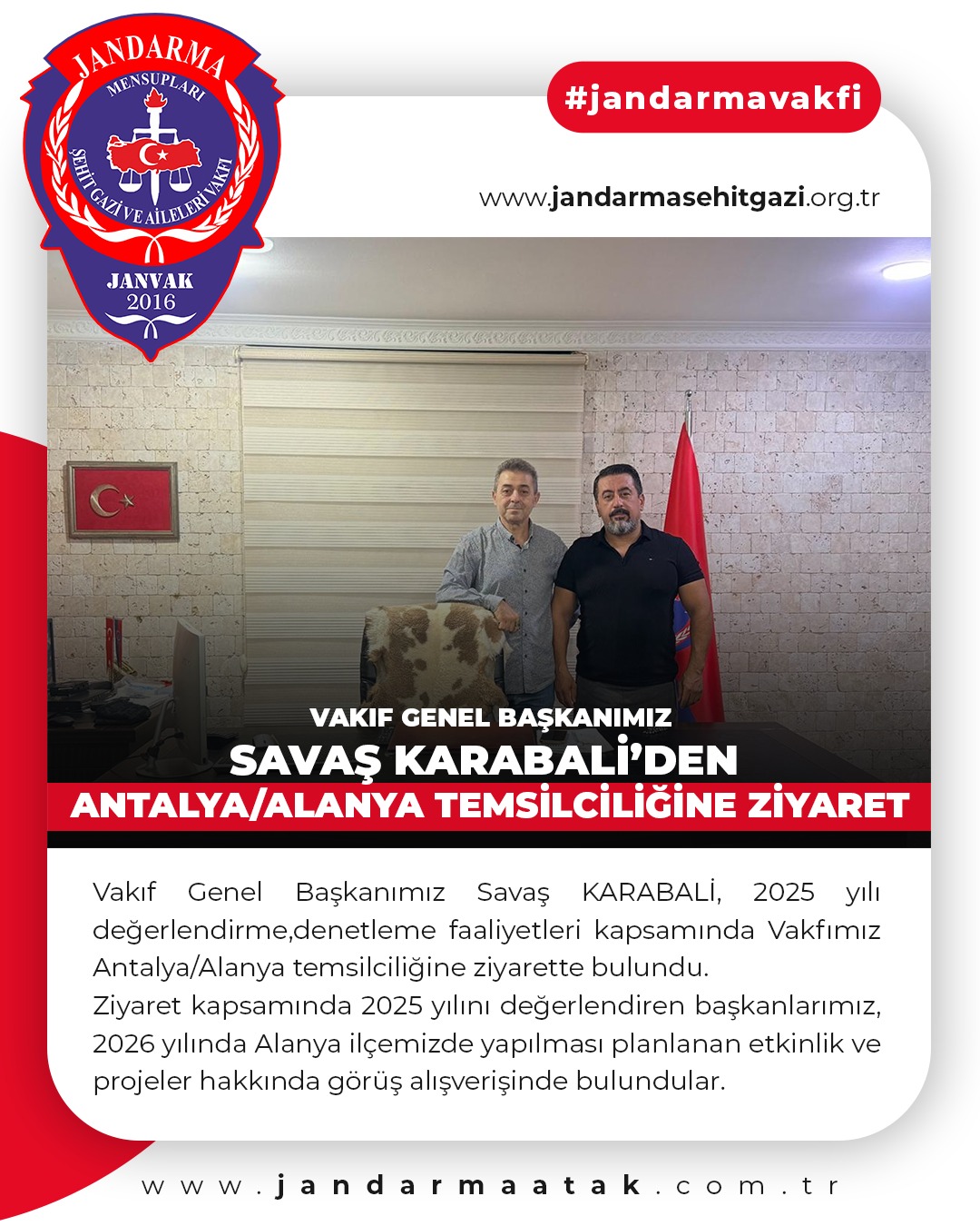Vakıf Genel Başkanımız Savaş KARABALİ, 2025 yılı değerlendirme,denetleme faaliyetleri kapsamında Vakfımız Antalya/Alanya temsilciliğine ziyarette bulundu.